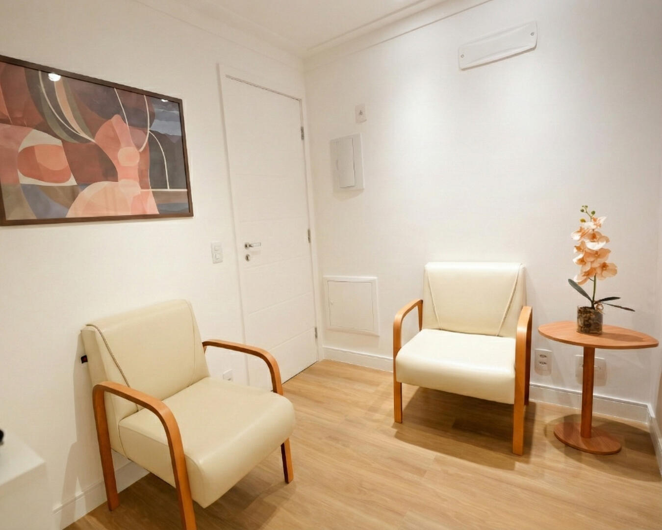 Cada detalhe do Espaço Aluma foi pensado para criar uma atmosfera silenciosamente acolhedora, onde o profissional se sente seguro para exercer seu trabalho e o paciente se sente à vontade desde a chegada.